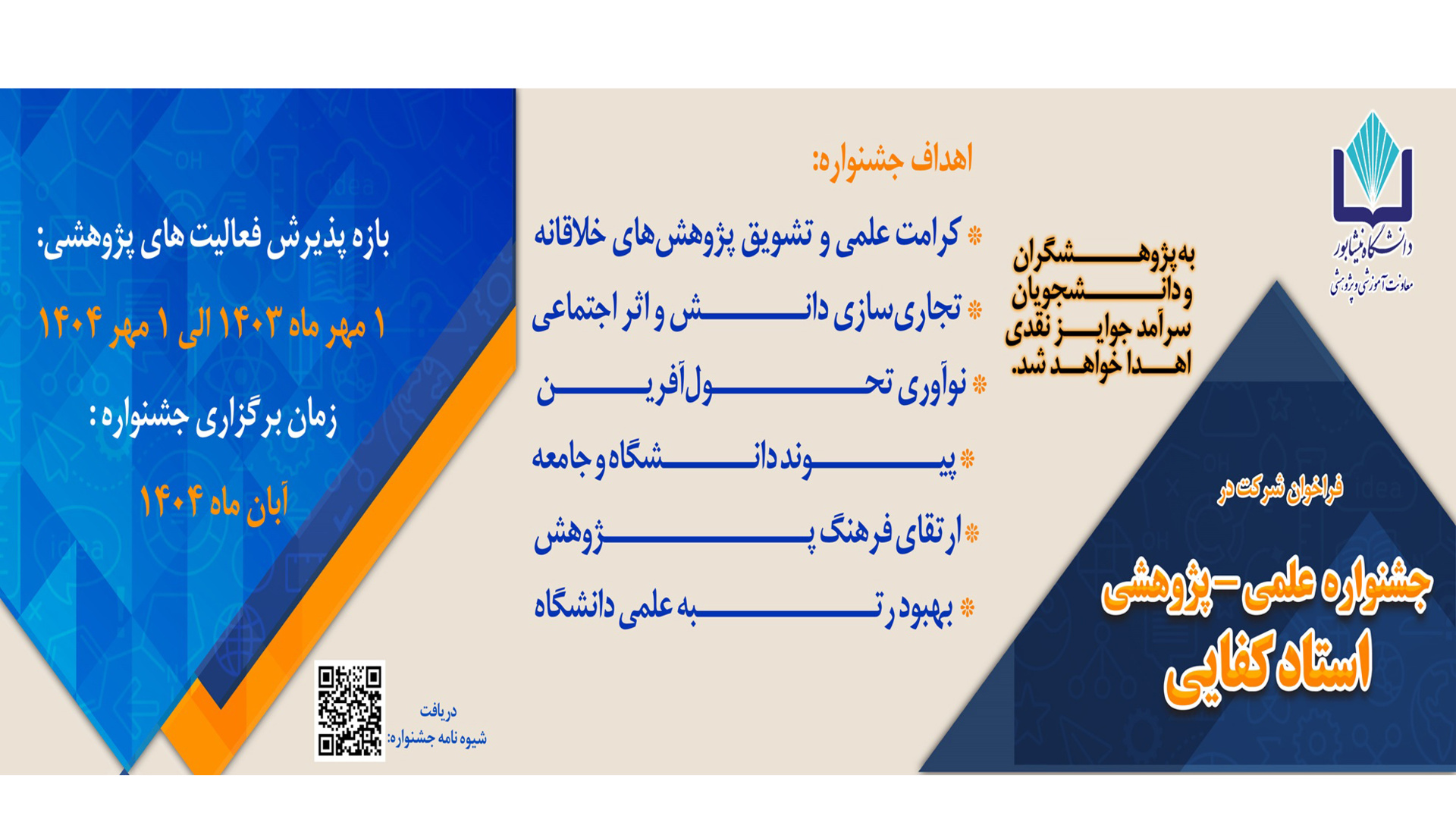 حوزه معاونت آموزشی و پژوهشی دانشگاه در نظر دارد «جشنواره علمی پژوهشی استاد کفایی» را با حمایت خیّر فرهیخته جناب استاد کفایی در آبان ماه 1404 برگزار نماید.